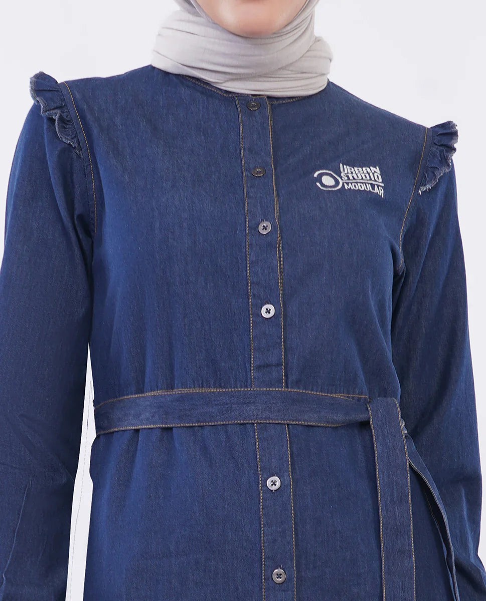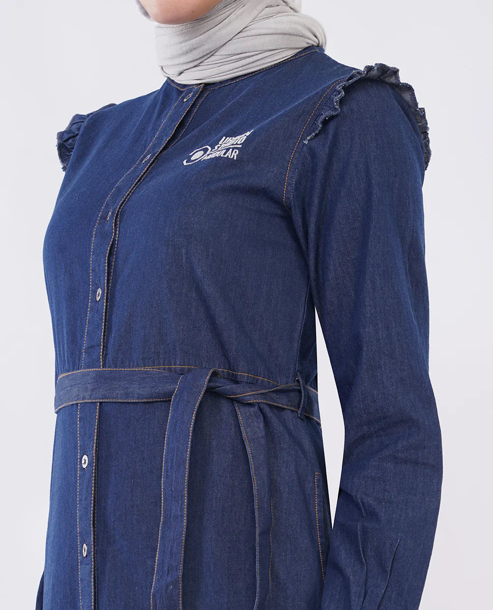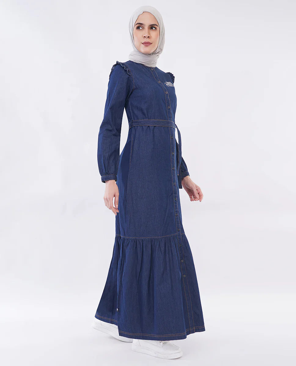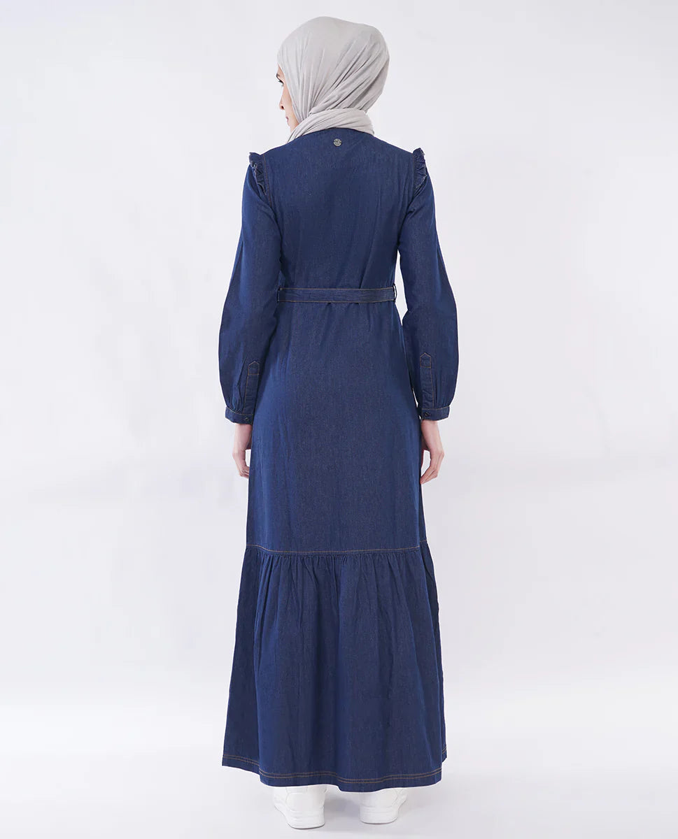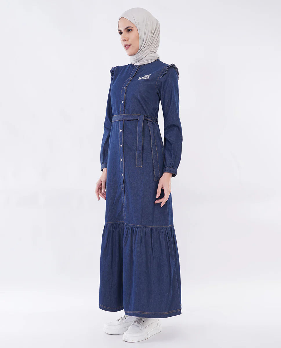 جلابية ماكسي من الدنيم الفاخر باللون الأزرق الثلجي مع كشكشة متدفقة
